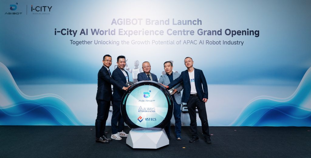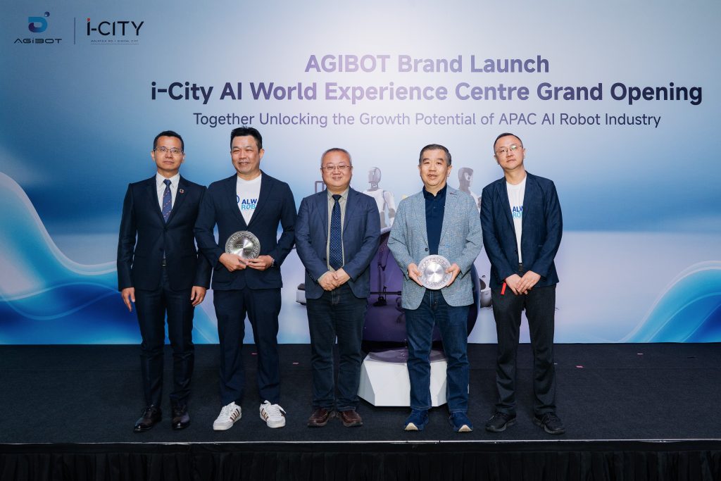 从左至右: 邓丰  (AGIBOT President Asia Pacific Region)、吴政锞 (Always Robots 首席执行官 / Always Marketing 马来西亚集团总裁)、姜青松 (AGIBOT Partner / Co-President)、宋昭雄 (VSTECS 首席执行官)、朱涵峥 (Always Marketing 上海 战略与投资副总裁)